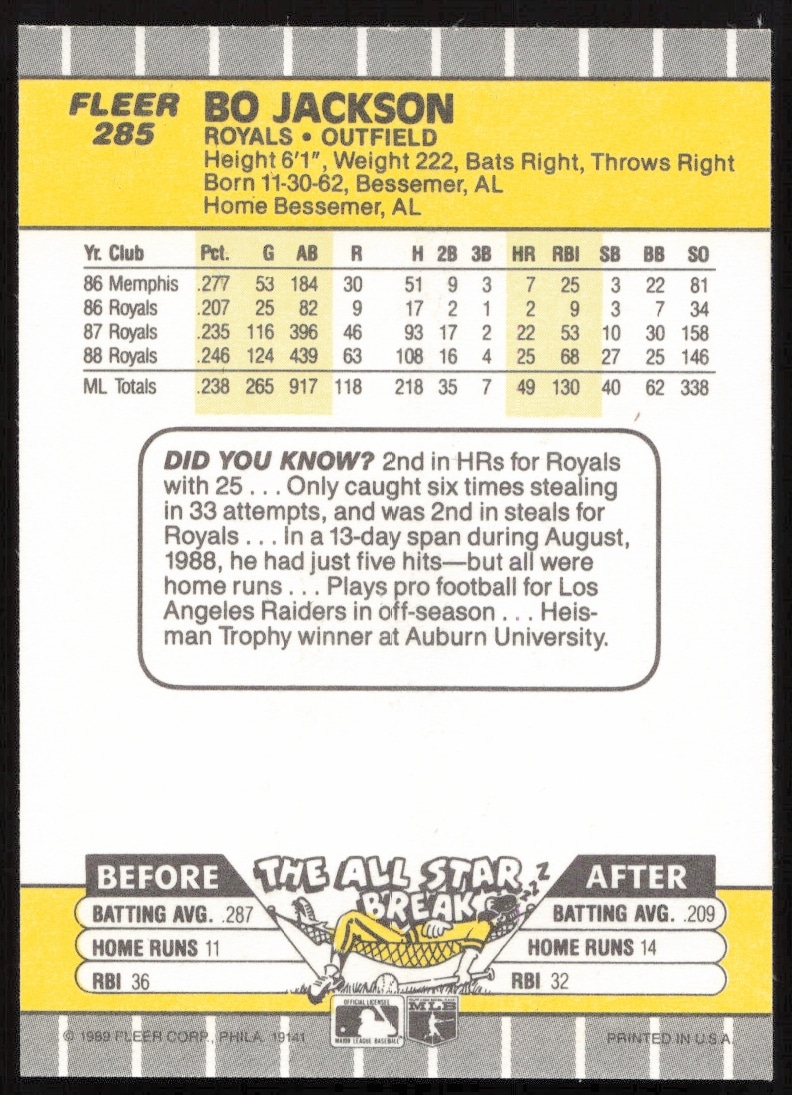This Baseball card, from 1989 is part of the Fleer card set. Bo Jackson is featured and has a card number of 285.