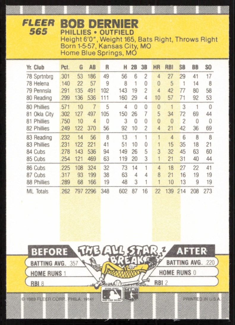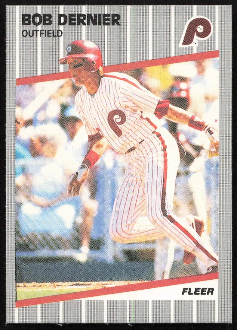 This Baseball card, from 1989 is part of the Fleer card set. Bob Dernier is featured and has a card number of 565.