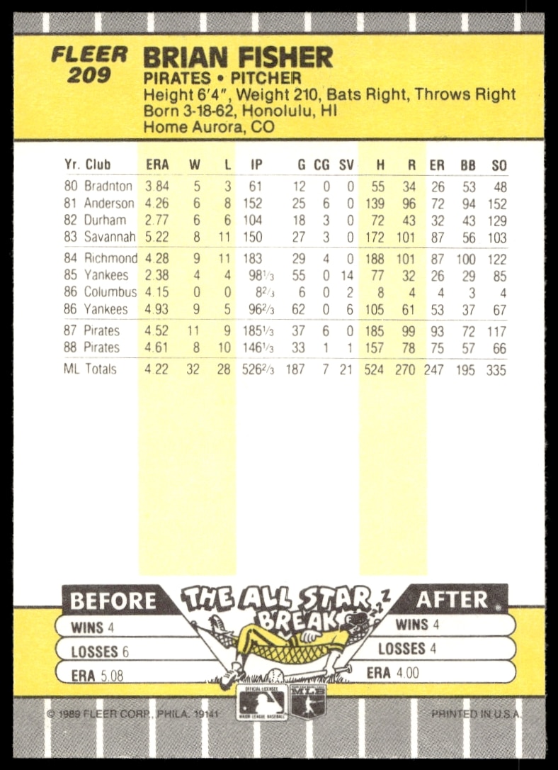 This Baseball card, from 1989 is part of the Fleer card set. Brian Fisher is featured and has a card number of 209.
