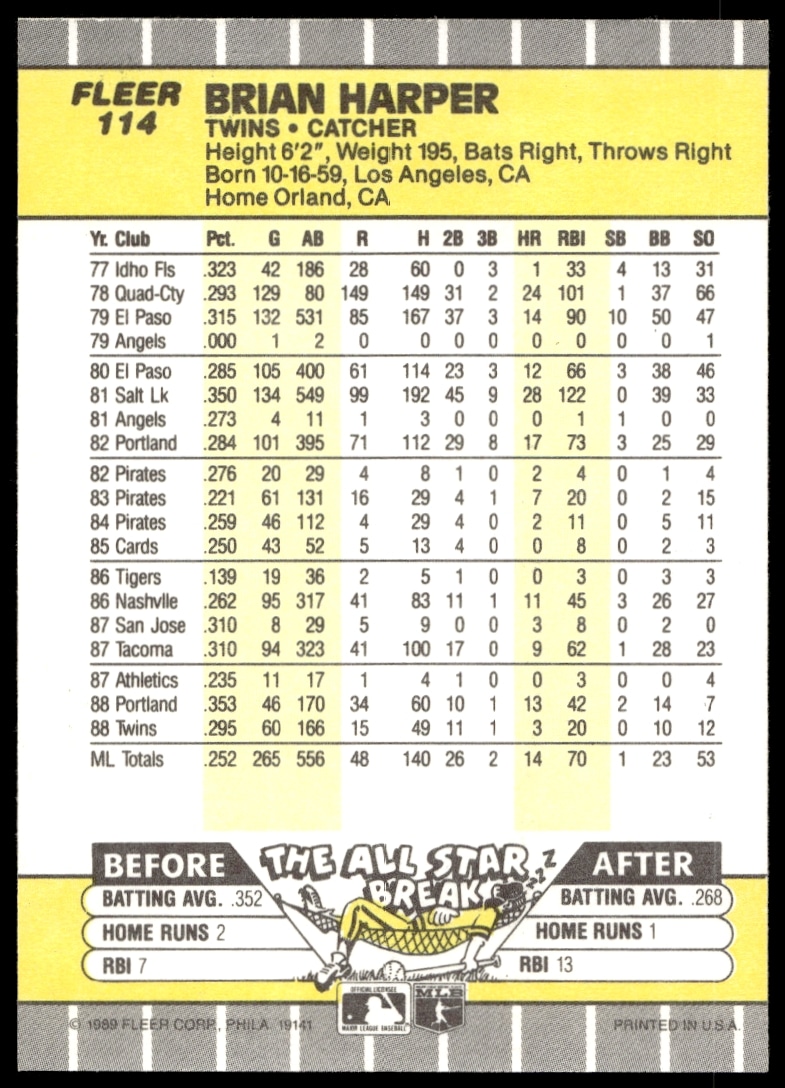 This Baseball card, from 1989 is part of the Fleer card set. Brian Harper is featured and has a card number of 114.