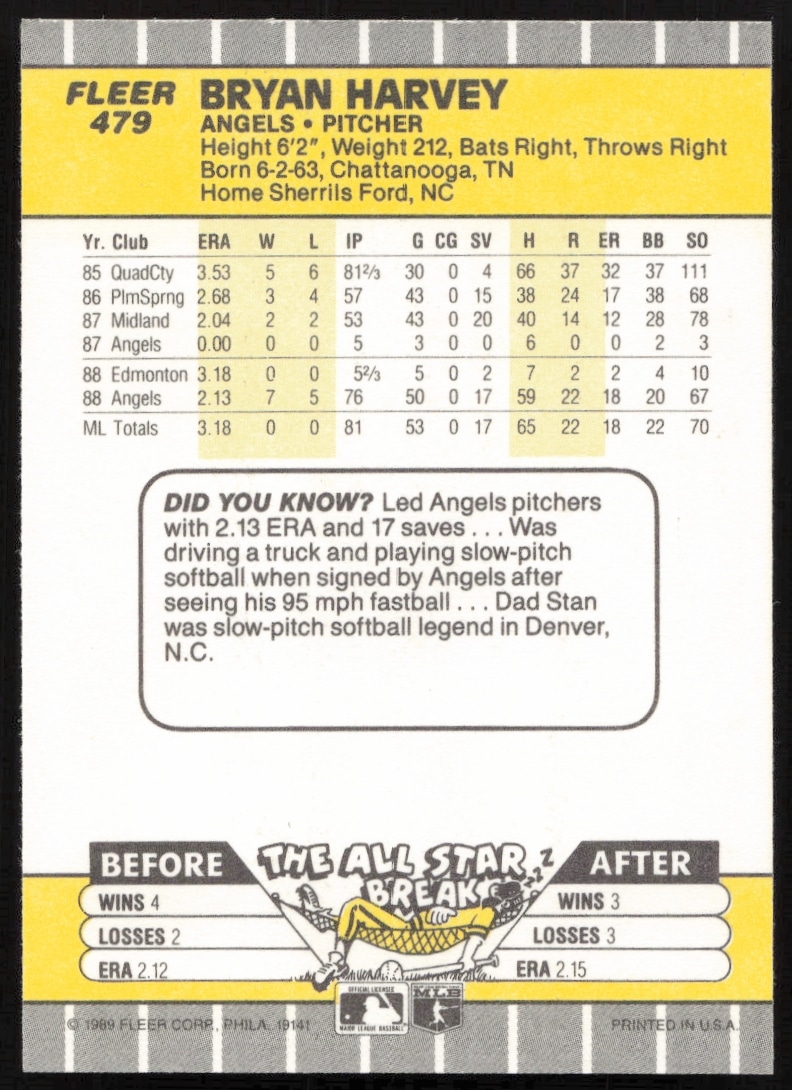This Baseball card, from 1989 is part of the Fleer card set. Bryan Harvey is featured and has a card number of 479.