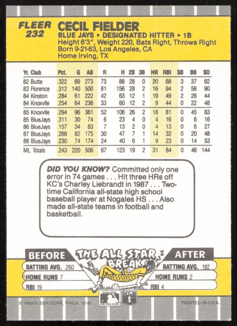 This Baseball card, from 1989 is part of the Fleer card set. Cecil Fielder is featured and has a card number of 232.