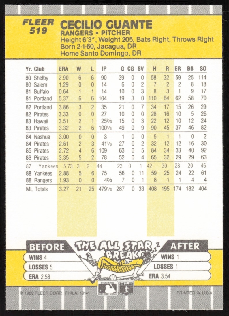 This Baseball card, from 1989 is part of the Fleer card set. Cecilio Guante is featured and has a card number of 519.