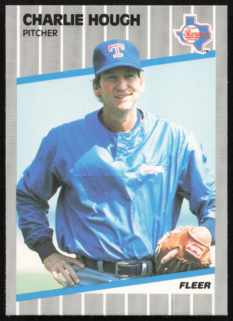 This Baseball card, from 1989 is part of the Fleer card set. Charlie Hough is featured and has a card number of 522.