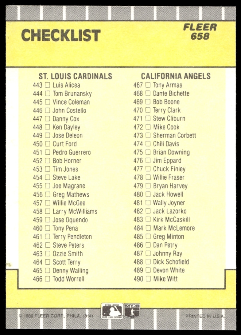 This Baseball card, from 1989 is part of the Fleer card set. Checklist: Indians / Cubs / Cardinals / Angels CL is featured and has a card number of 658.