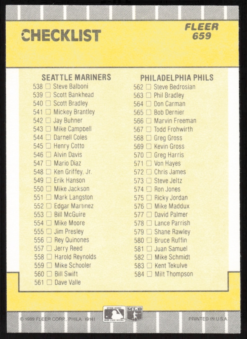 This Baseball card, from 1989 is part of the Fleer card set. Checklist: White Sox / Rangers / Mariners / Phillies CL, UER is featured and has a card number of 659.