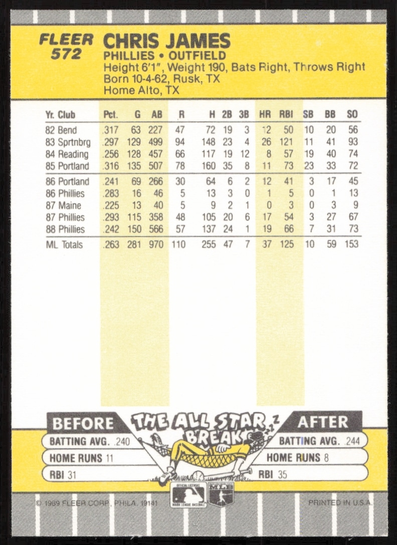 This Baseball card, from 1989 is part of the Fleer card set. Chris James is featured and has a card number of 572.