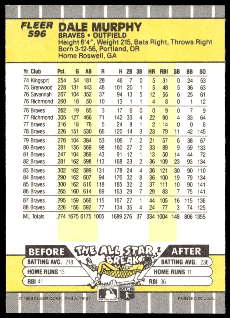 This Baseball card, from 1989 is part of the Fleer card set. Dale Murphy is featured and has a card number of 596.