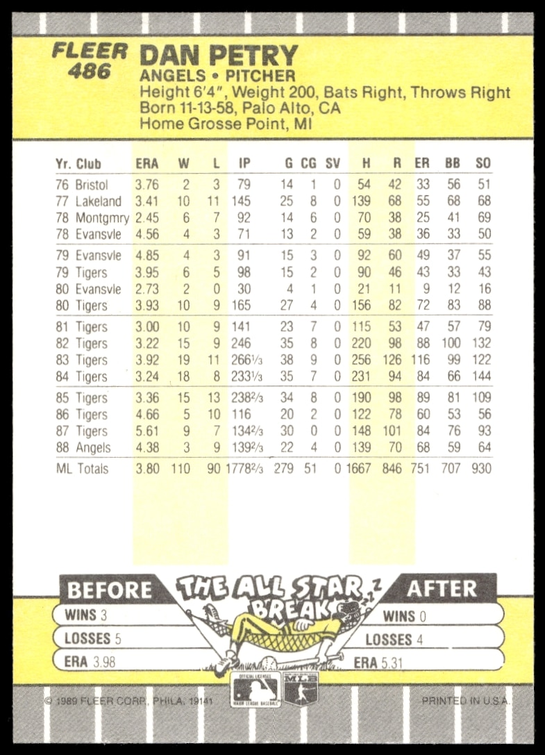 This Baseball card, from 1989 is part of the Fleer card set. Dan Petry is featured and has a card number of 486.