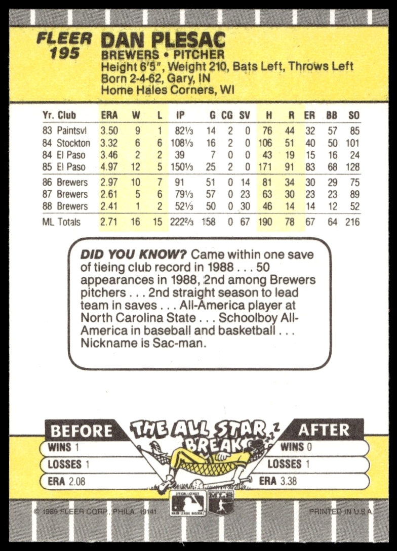 This Baseball card, from 1989 is part of the Fleer card set. Dan Plesac is featured and has a card number of 195.