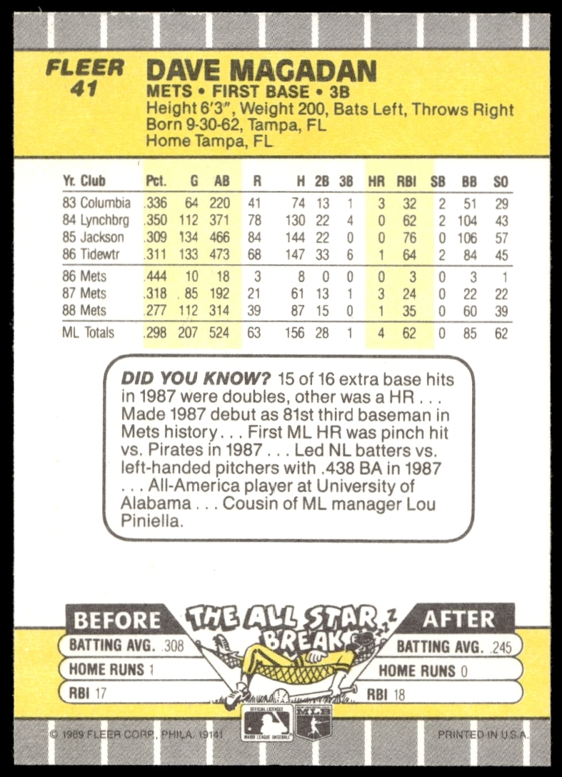 This Baseball card, from 1989 is part of the Fleer card set. Dave Magadan is featured and has a card number of 41.