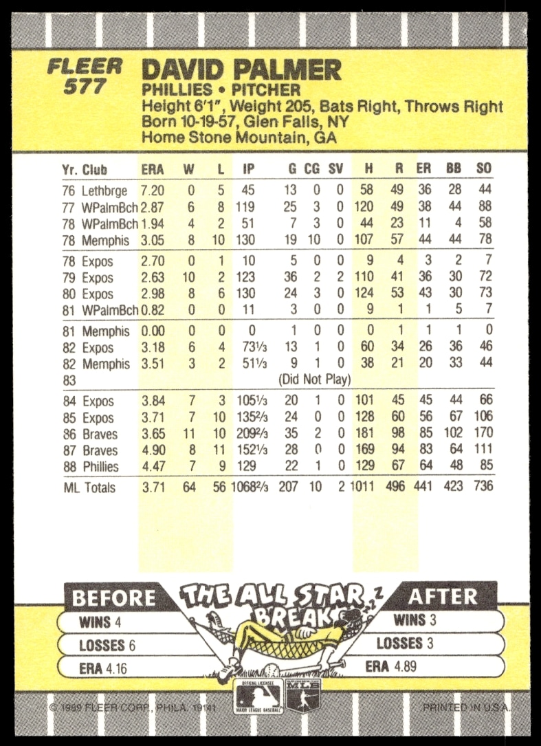 This Baseball card, from 1989 is part of the Fleer card set. David Palmer is featured and has a card number of 577.