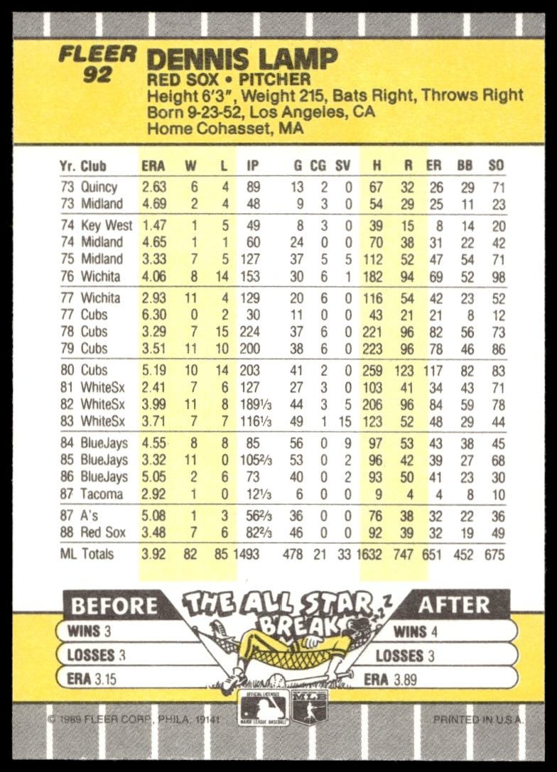 This Baseball card, from 1989 is part of the Fleer card set. Dennis Lamp is featured and has a card number of 92.