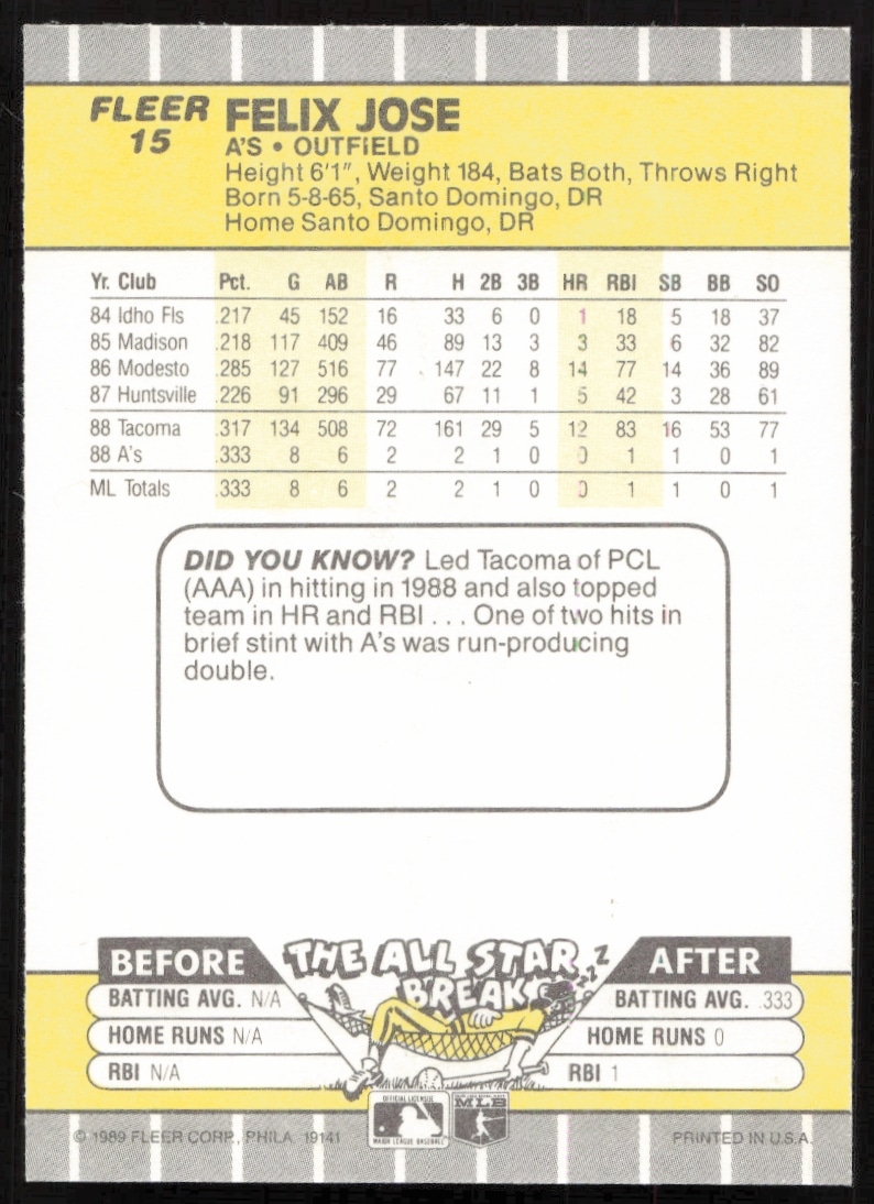 This Baseball card, from 1989 is part of the Fleer card set. Felix Jose is featured and has a card number of 15.