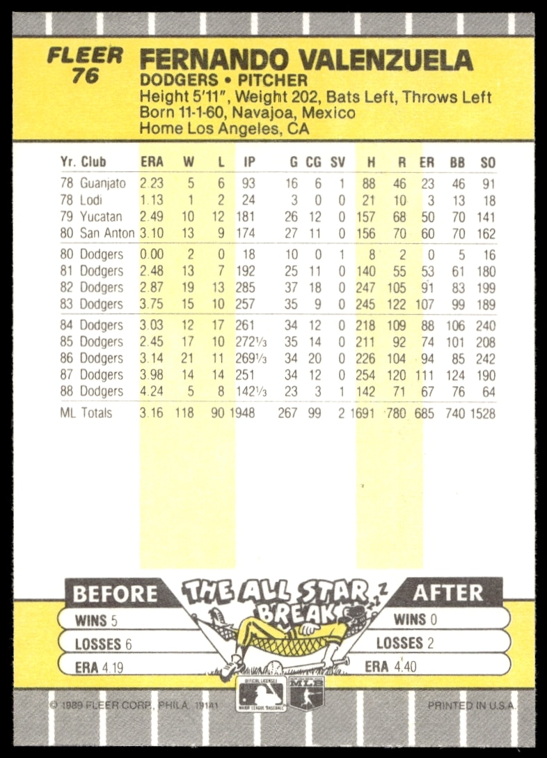 This Baseball card, from 1989 is part of the Fleer card set. Fernando Valenzuela is featured and has a card number of 76.