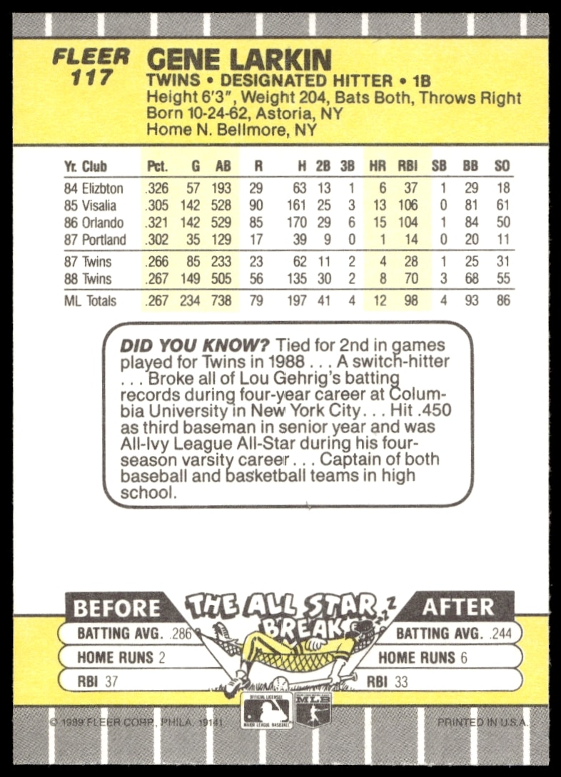 This Baseball card, from 1989 is part of the Fleer card set. Gene Larkin is featured and has a card number of 117.