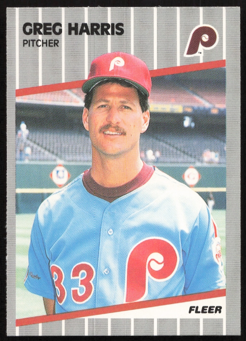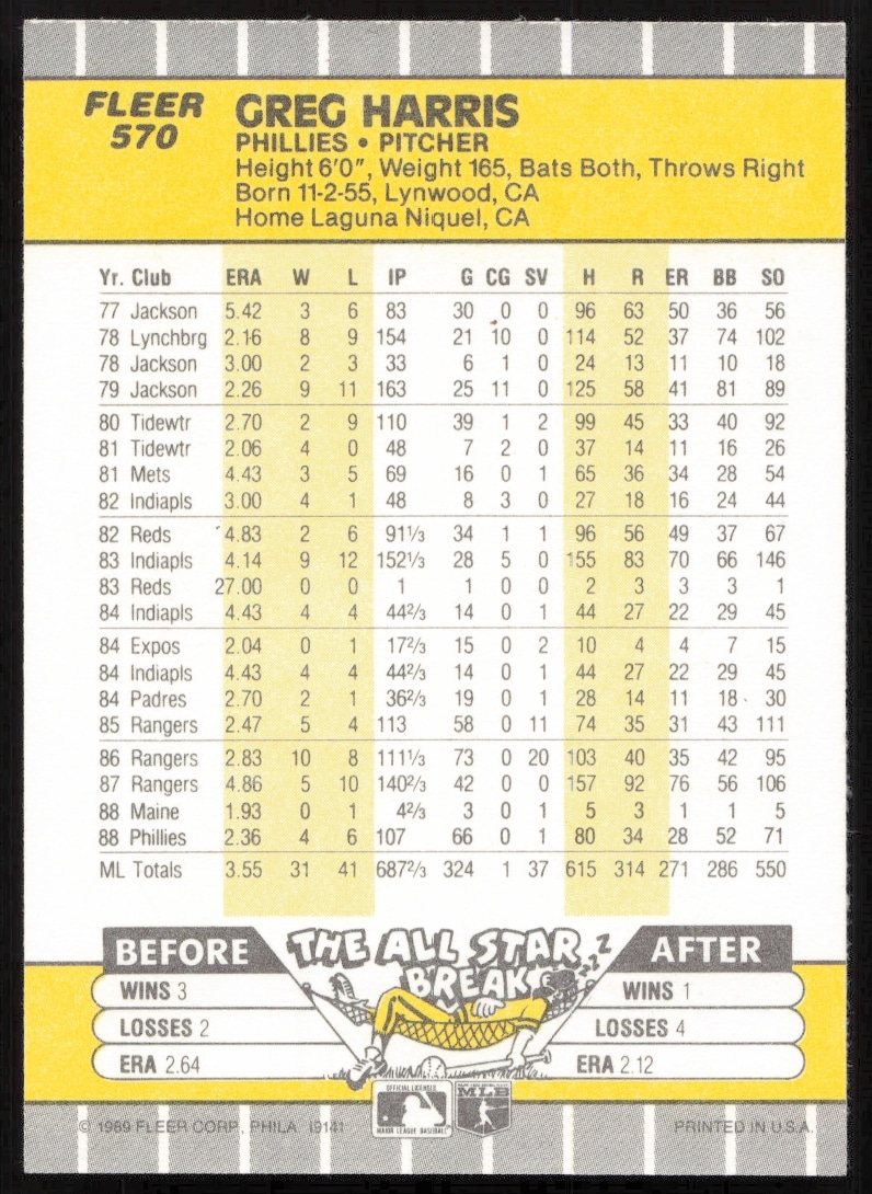 This Baseball card, from 1989 is part of the Fleer card set. Greg Harris is featured and has a card number of 570.
