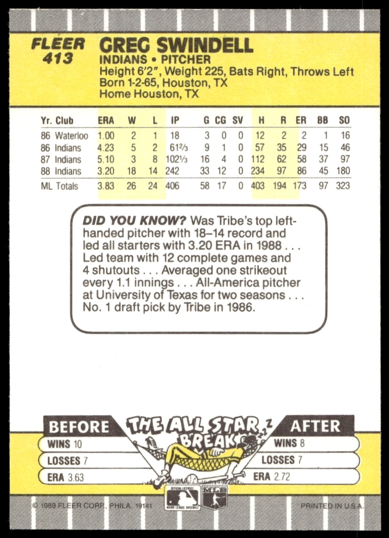 This Baseball card, from 1989 is part of the Fleer card set. Greg Swindell is featured and has a card number of 413.