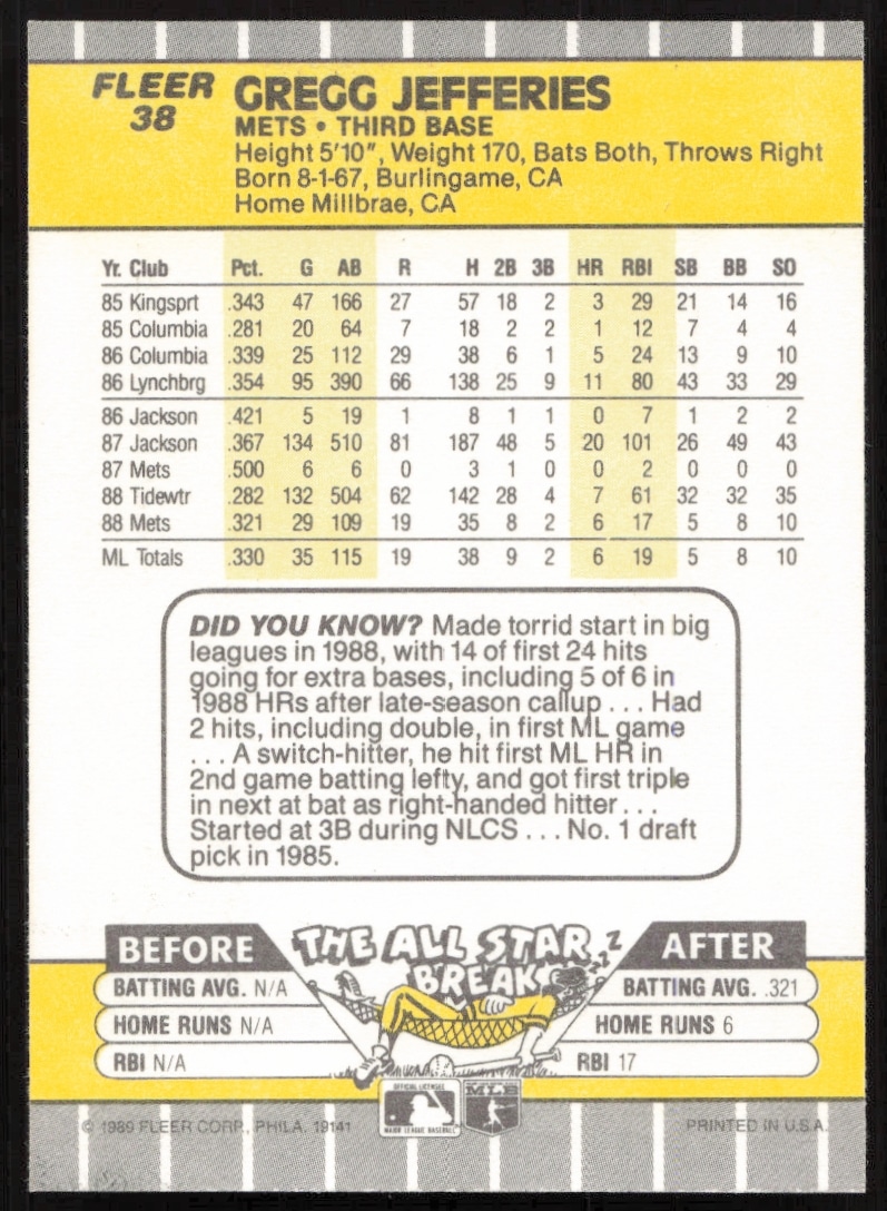This Baseball card, from 1989 is part of the Fleer card set. Gregg Jefferies is featured and has a card number of 38.