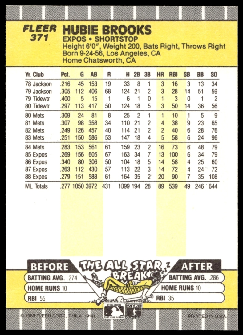 This Baseball card, from 1989 is part of the Fleer card set. Hubie Brooks is featured and has a card number of 371.