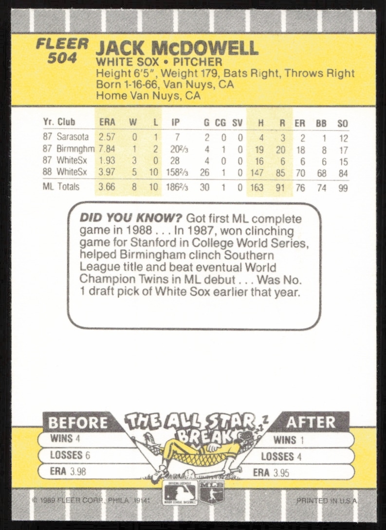 This Baseball card, from 1989 is part of the Fleer card set. Jack McDowell is featured and has a card number of 504.