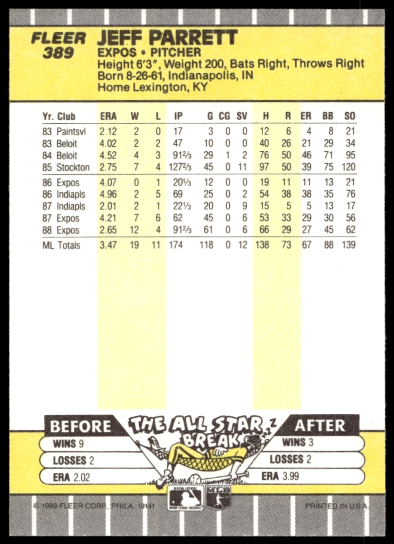 This Baseball card, from 1989 is part of the Fleer card set. Jeff Parrett is featured and has a card number of 389.