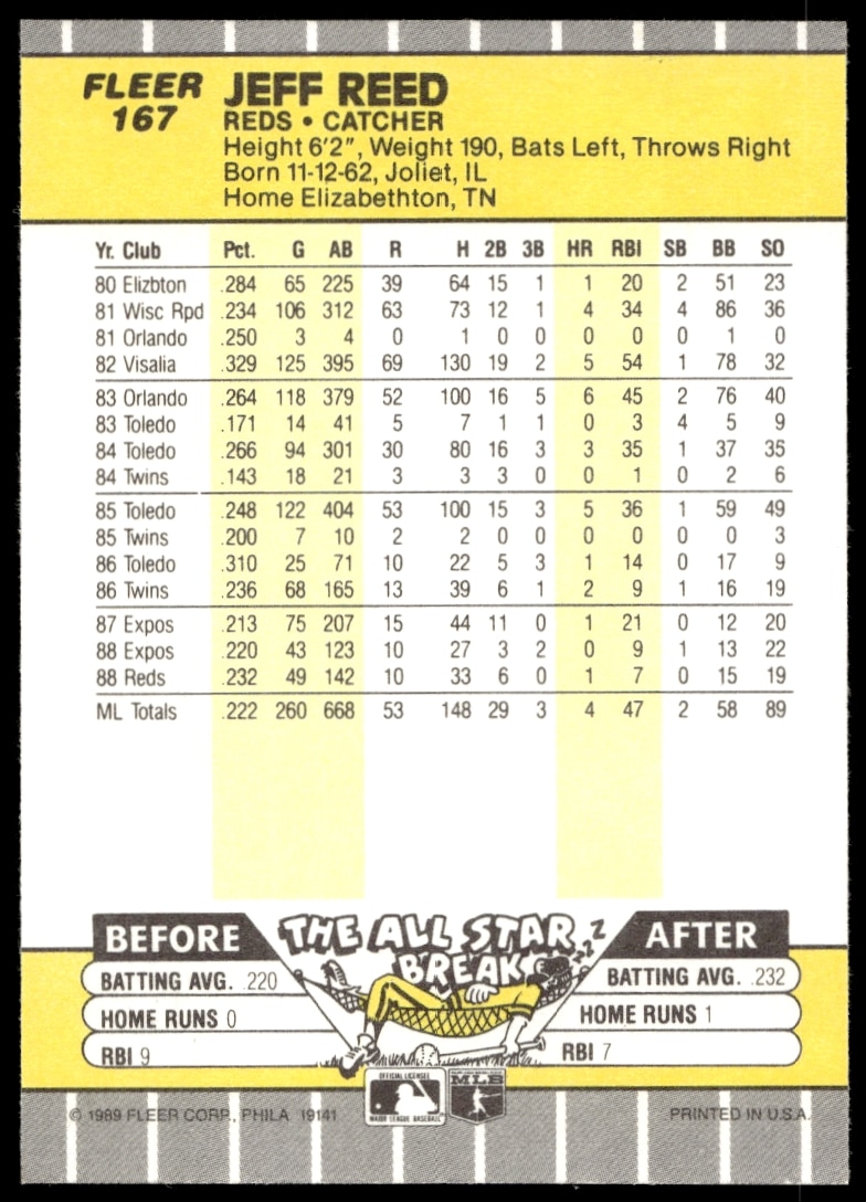 This Baseball card, from 1989 is part of the Fleer card set. Jeff Reed is featured and has a card number of 167.