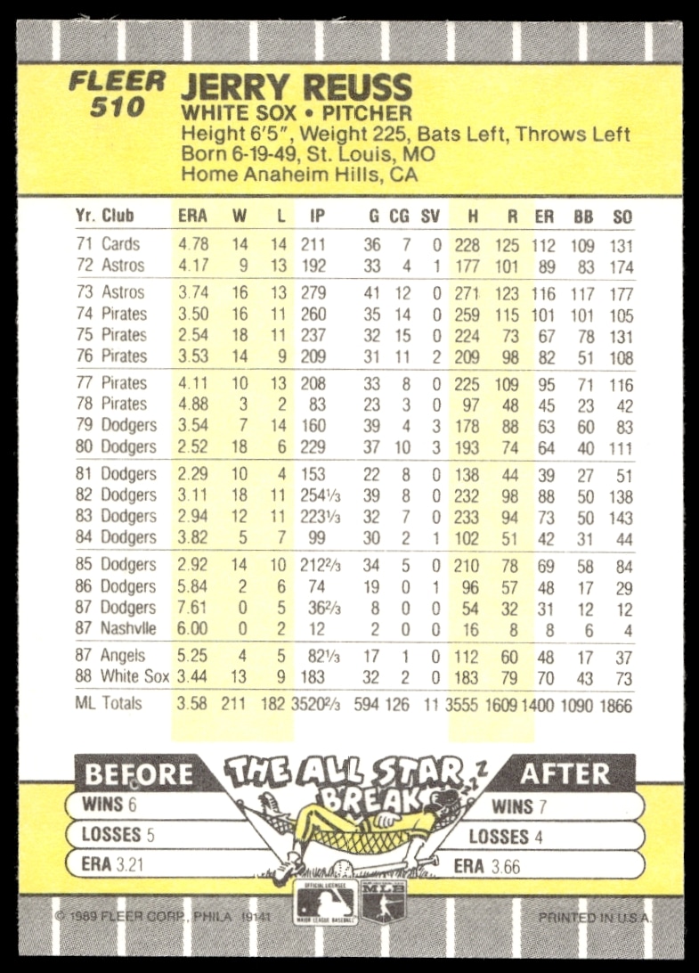 This Baseball card, from 1989 is part of the Fleer card set. Jerry Reuss is featured and has a card number of 510.