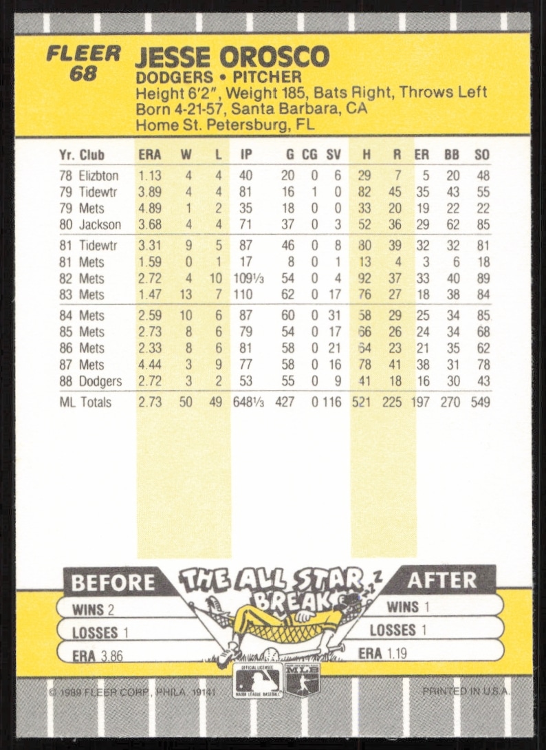 This Baseball card, from 1989 is part of the Fleer card set. Jesse Orosco is featured and has a card number of 68.