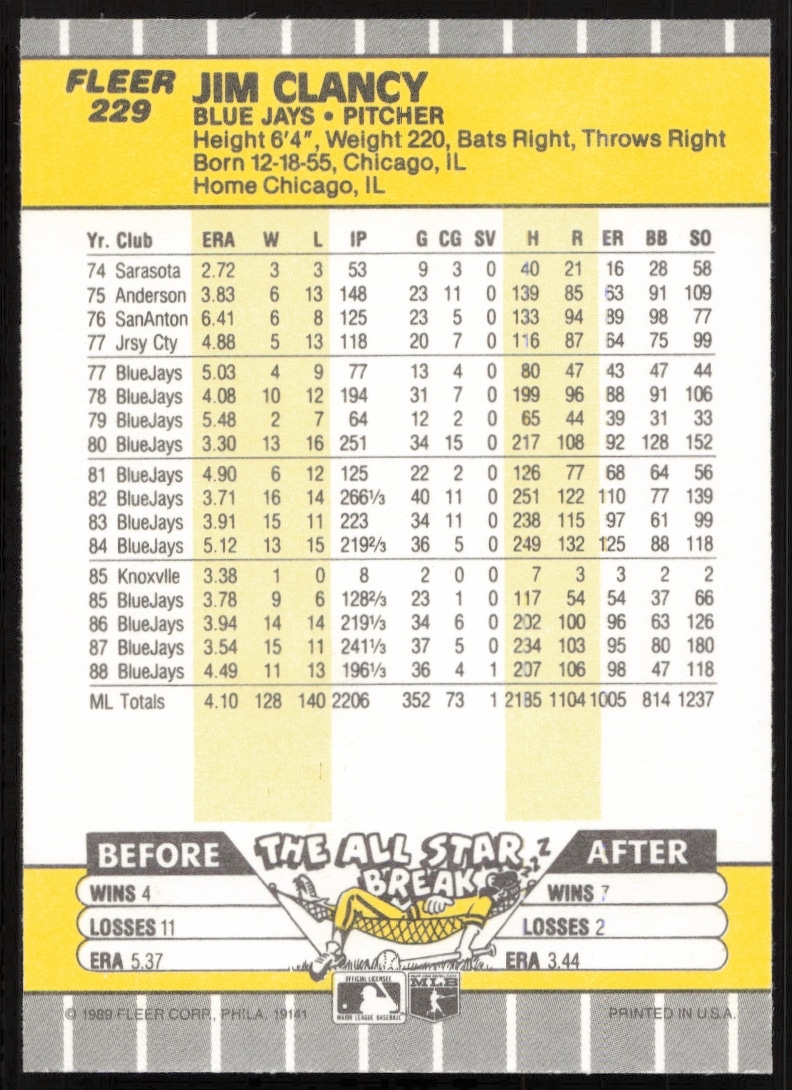 This Baseball card, from 1989 is part of the Fleer card set. Jim Clancy is featured and has a card number of 229.