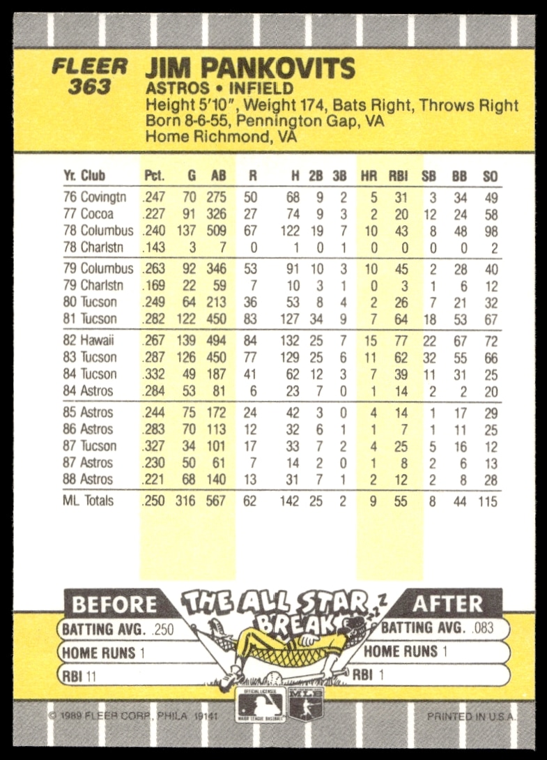 This Baseball card, from 1989 is part of the Fleer card set. Jim Pankovits is featured and has a card number of 363.