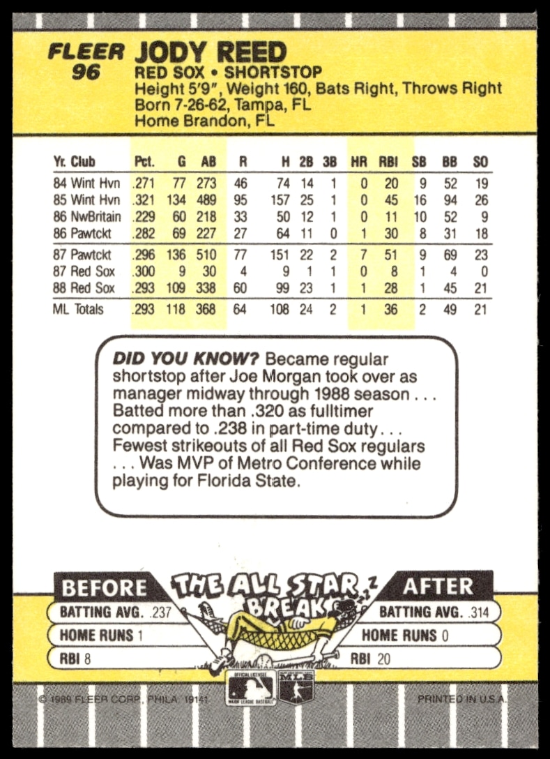 This Baseball card, from 1989 is part of the Fleer card set. Jody Reed is featured and has a card number of 96.