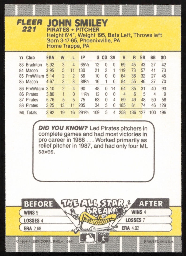 This Baseball card, from 1989 is part of the Fleer card set. John Smiley is featured and has a card number of 221.