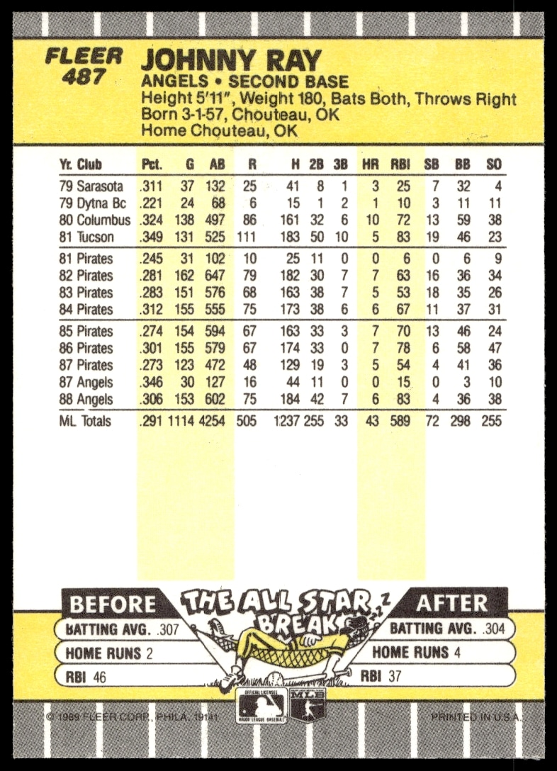 This Baseball card, from 1989 is part of the Fleer card set. Johnny Ray is featured and has a card number of 487.