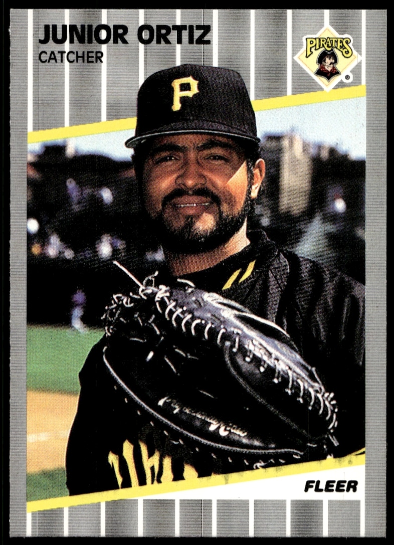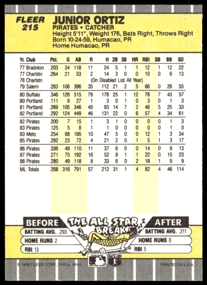 This Baseball card, from 1989 is part of the Fleer card set. Junior Ortiz is featured and has a card number of 215.