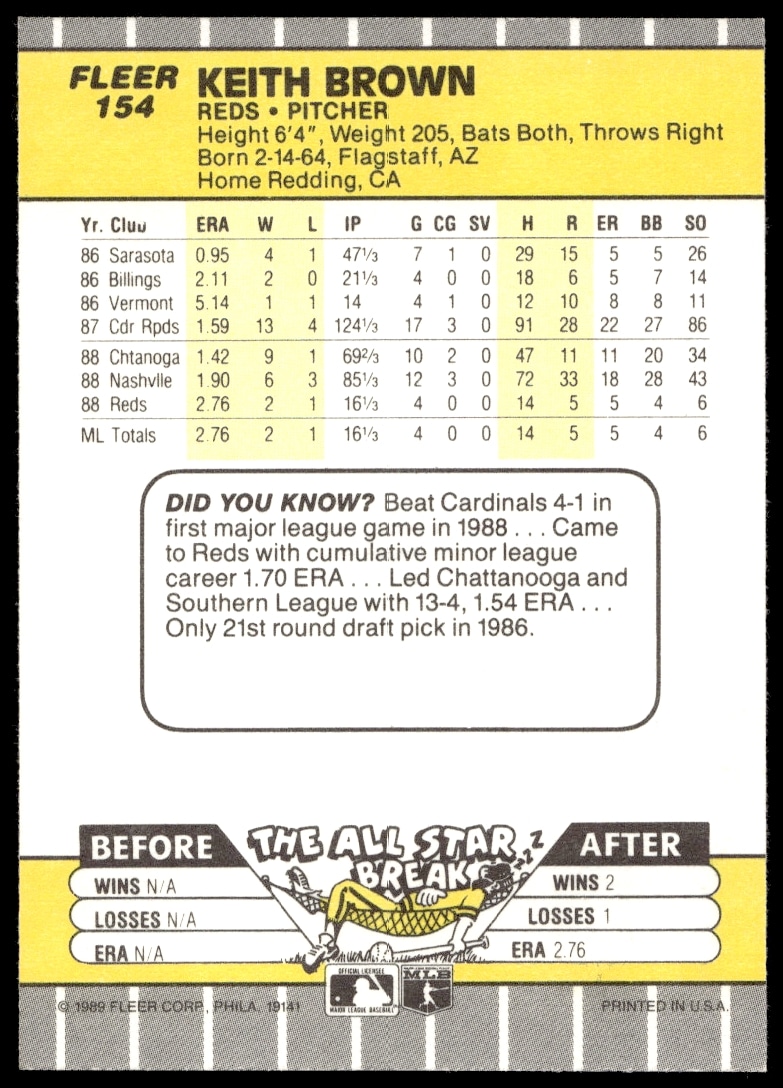This Baseball card, from 1989 is part of the Fleer card set. Keith Brown is featured and has a card number of 154.
