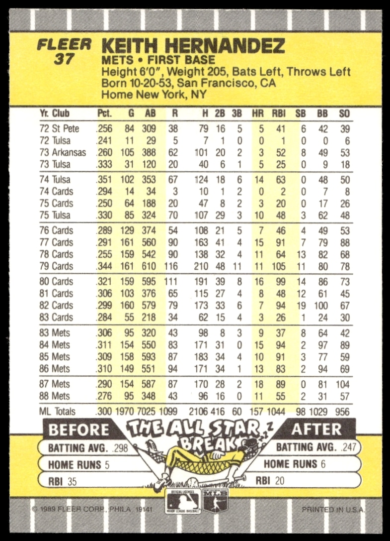 This Baseball card, from 1989 is part of the Fleer card set. Keith Hernandez is featured and has a card number of 37.