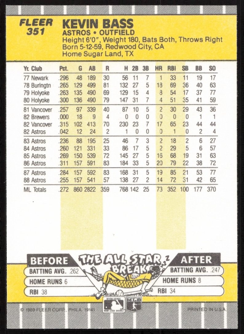 This Baseball card, from 1989 is part of the Fleer card set. Kevin Bass is featured and has a card number of 351.