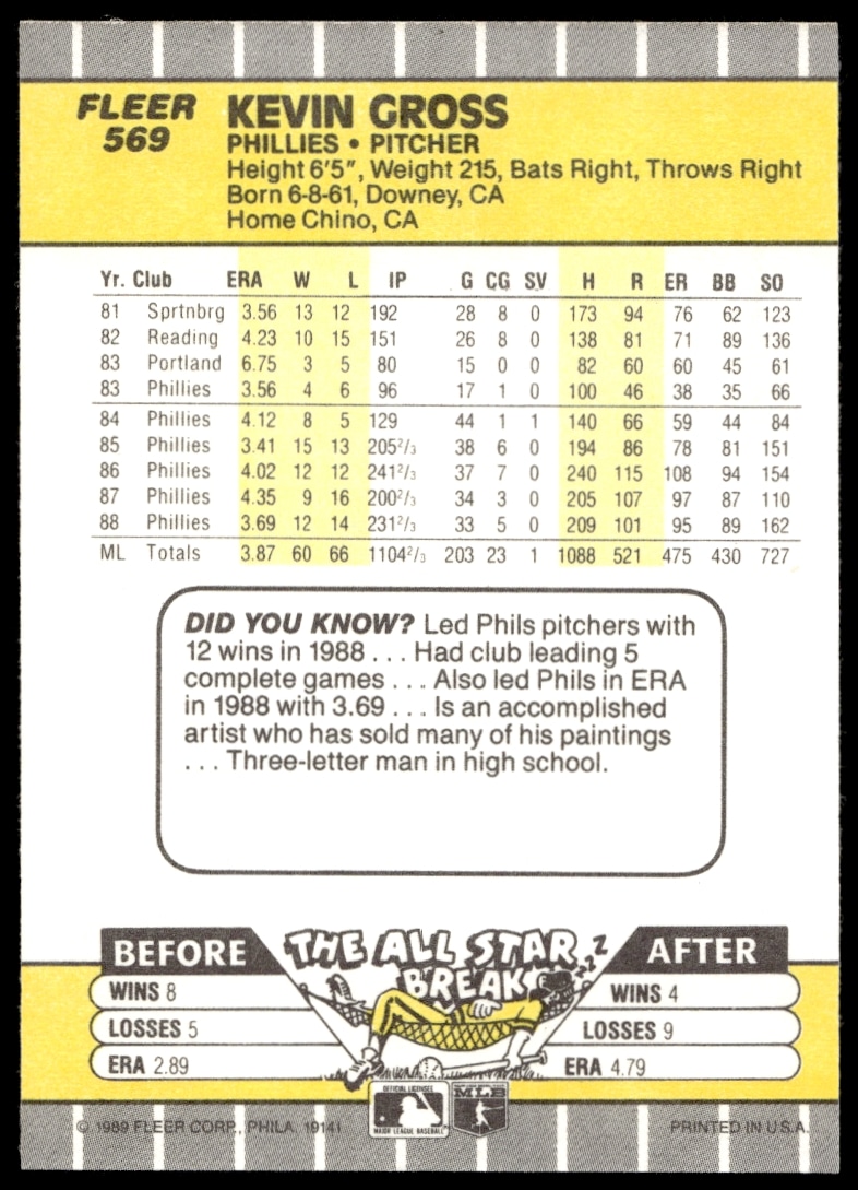 This Baseball card, from 1989 is part of the Fleer card set. Kevin Gross is featured and has a card number of 569.