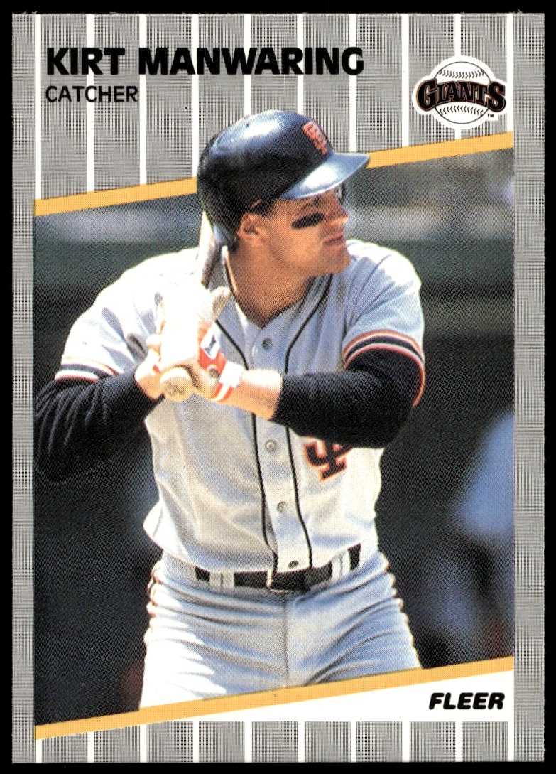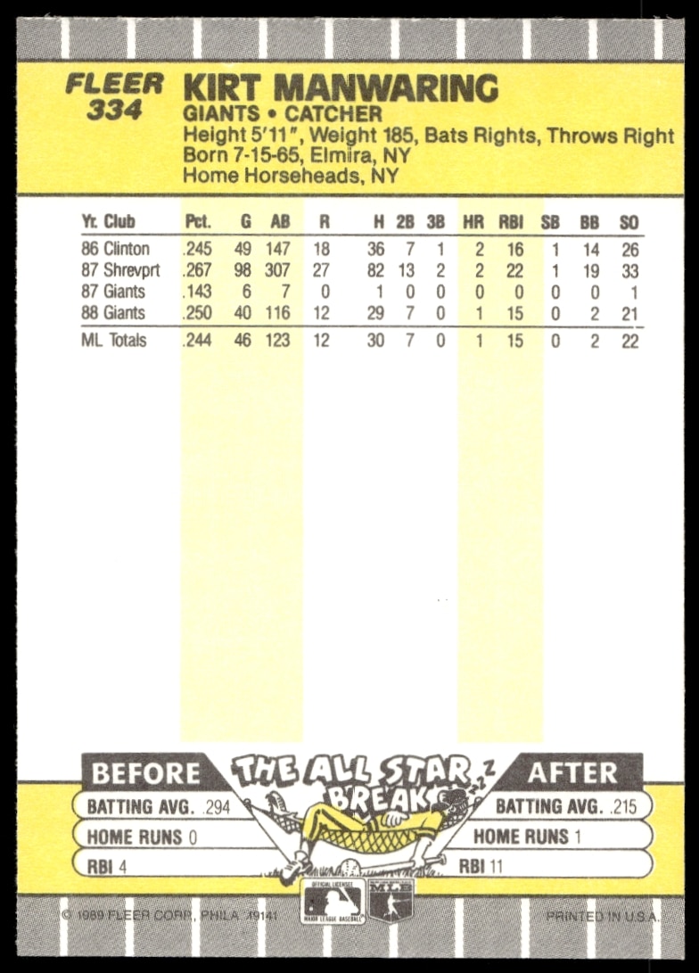 This Baseball card, from 1989 is part of the Fleer card set. Kirt Manwaring is featured and has a card number of 334.