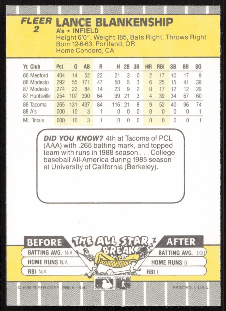 This Baseball card, from 1989 is part of the Fleer card set. Lance Blankenship is featured and has a card number of 2.