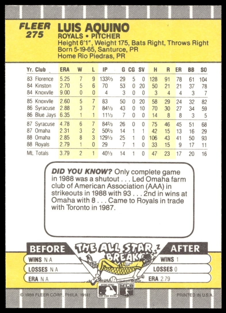 This Baseball card, from 1989 is part of the Fleer card set. Luis Aquino is featured and has a card number of 275.