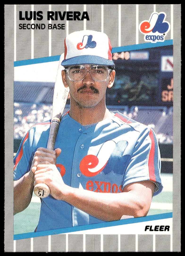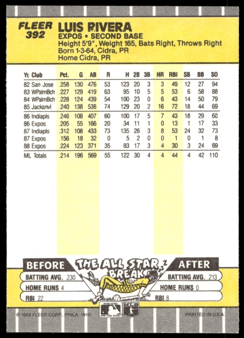 This Baseball card, from 1989 is part of the Fleer card set. Luis Rivera is featured and has a card number of 392.