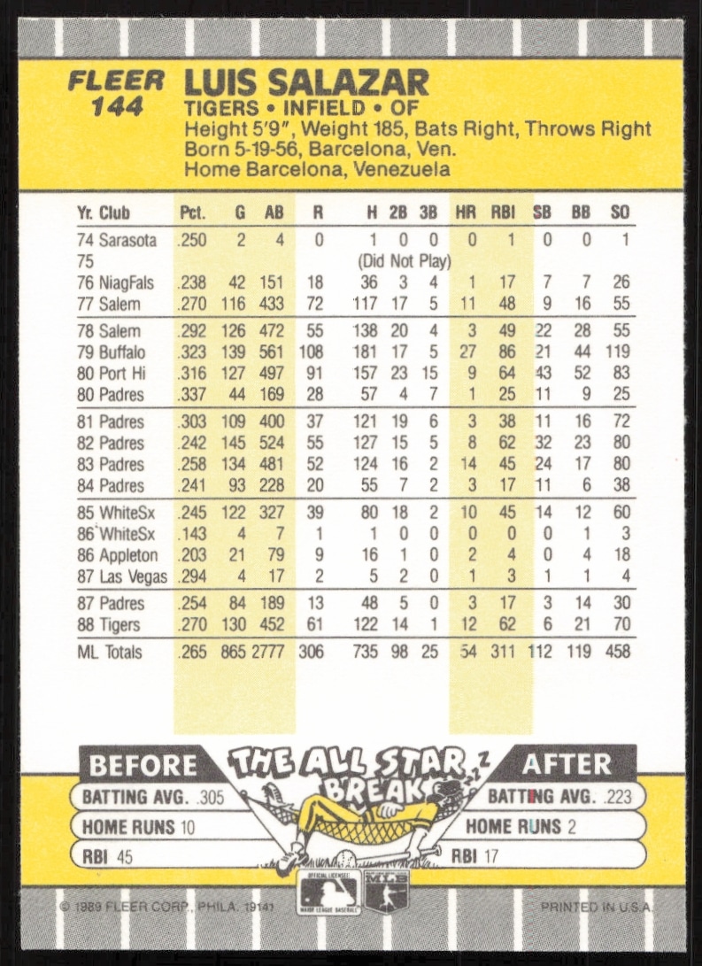 This Baseball card, from 1989 is part of the Fleer card set. Luis Salazar is featured and has a card number of 144.