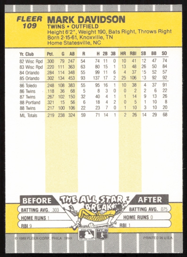 This Baseball card, from 1989 is part of the Fleer card set. Mark Davidson is featured and has a card number of 109.