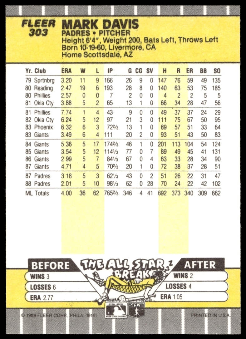 This Baseball card, from 1989 is part of the Fleer card set. Mark Davis is featured and has a card number of 303.