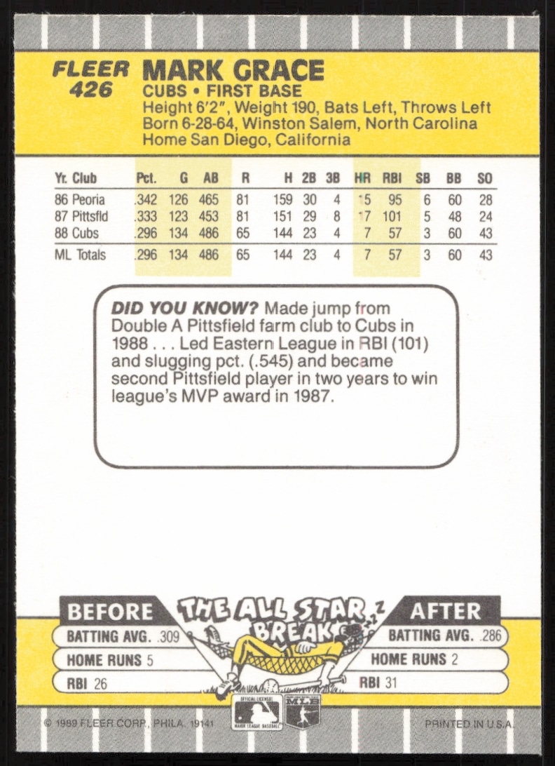 This Baseball card, from 1989 is part of the Fleer card set. Mark Grace is featured and has a card number of 426.