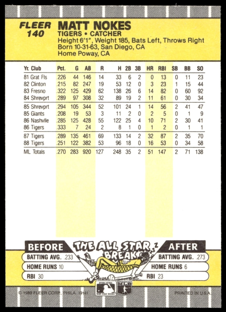 This Baseball card, from 1989 is part of the Fleer card set. Matt Nokes is featured and has a card number of 140.