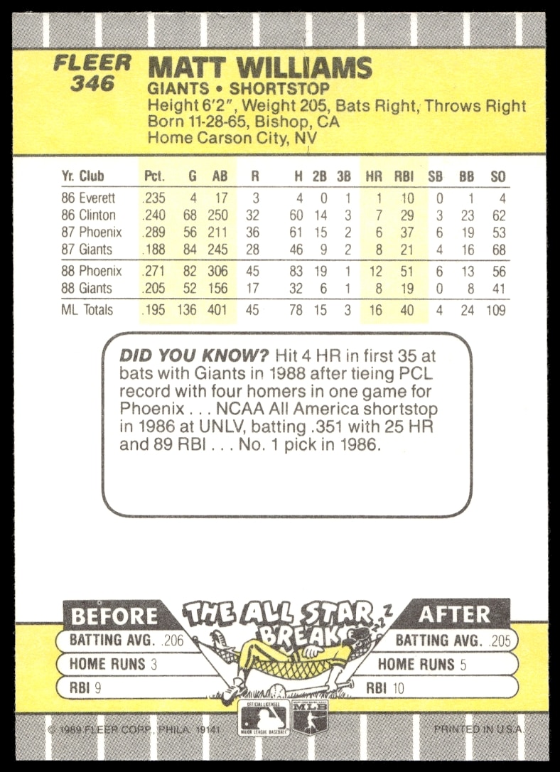 This Baseball card, from 1989 is part of the Fleer card set. Matt Williams is featured and has a card number of 346.