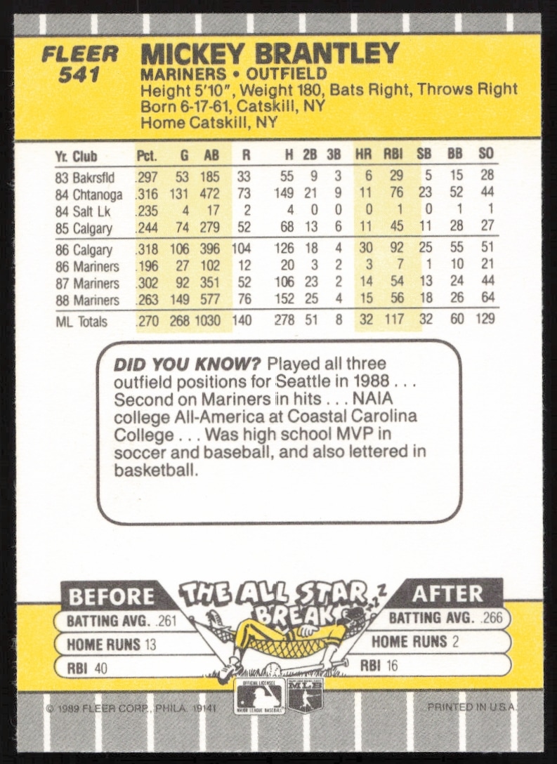 This Baseball card, from 1989 is part of the Fleer card set. Mickey Brantley is featured and has a card number of 541.